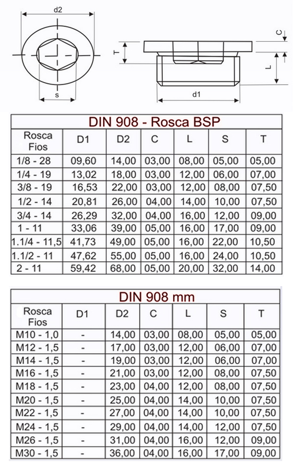 Bujão para óleo DIN 908 – BSP MATERIAL: Aço liga DUREZA: 5.8 ACABAMENTO: Oxidação preta Disponível em diversas medidas conforme tabela.