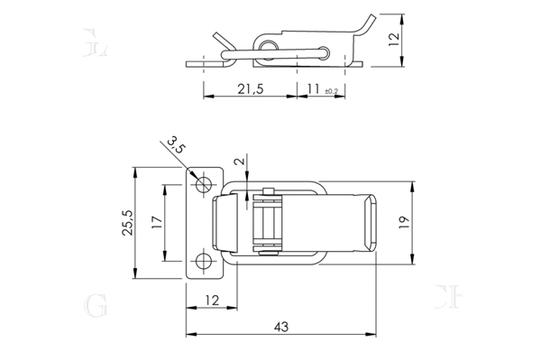 Fecho de ação rápida de tamanho pequeno com furo para trava e mola curva pequena, adequado para pequenos travamentos e com aplicações em diversas áreas industriais como: alimentícia, automotiva, moveleira, farmacêutica, etc.