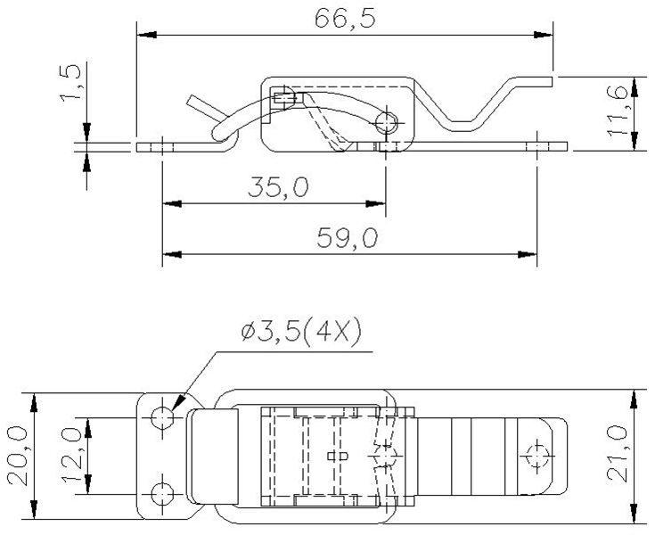 Fecho de ação rápida de tamanho pequeno com furo para trava e mola curva pequena, adequado para pequenos travamentos e com aplicações em diversas áreas industriais como: alimentícia, automotiva, moveleira, farmacêutica, etc.
