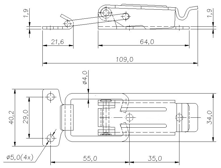 Fecho de ação rápida de tamanho pequeno com furo para trava e mola curva pequena, adequado para pequenos travamentos e com aplicações em diversas áreas industriais como: alimentícia, automotiva, moveleira, farmacêutica, etc.