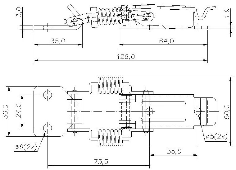 Fecho de ação rápida de tamanho pequeno com furo para trava e mola curva pequena, adequado para pequenos travamentos e com aplicações em diversas áreas industriais como: alimentícia, automotiva, moveleira, farmacêutica, etc.