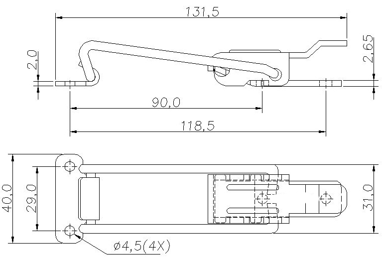 Fecho de ação rápida de tamanho pequeno com furo para trava e mola curva pequena, adequado para pequenos travamentos e com aplicações em diversas áreas industriais como: alimentícia, automotiva, moveleira, farmacêutica, etc.
